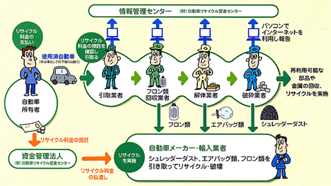●シュレッダーダストおよび新たな環境問題であるエアバッグ類、カーエアコンのフロン類を自動車メーカー・輸入業者が引き取ってリサイクル(フロン類については破壊)