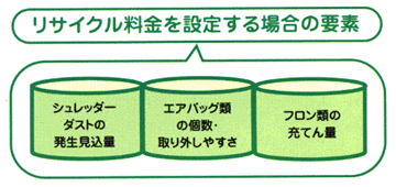 リサイクル料金はシュレッダーダストの発生見込量、エアバッグ類の個数・取り外しやすさ、フロン類の充てん量などを踏まえ、自動車1台ごとに自動車メーカー・輸入業者が設定します。