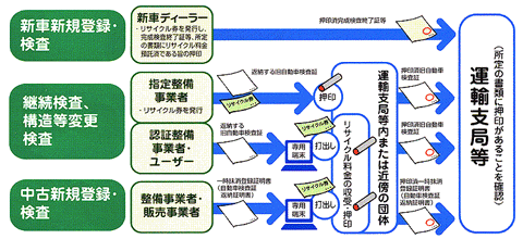 今年の2月1日以降、新車新規登録・検査、継続検査、構造等変更検査、中古新規登録・検査を受ける際に、運輸支局等においてリサイクル料金が預託されているか否かが確認され、預託されていない場合、登録・検査が受けられなくなっています。具体的には、リサイクル料金が預託されていることを証明するリサイクル券を活用し、主に以下の方法でリサイクル料金預託の有無が確認されます(リサイクル券は紛失されないよう、自動車検査証などと共に適切に保管ください)