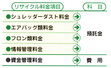 新車購入時預託、継続検査時預託で預託した場合は、シュレッダーダスト量気温、エアバッグ類料金、フロン類料金、情報管理料金の4つの料金は、「自動車所有者の資産」として位置付けられます。事業者として会計処理を行う場合は、預託金として資産勘定に計上してください(費用として処理することはできません)。資金管理料金は、預託金として資金勘定に計上するのではなく、支払った時点で費用処理してください。
